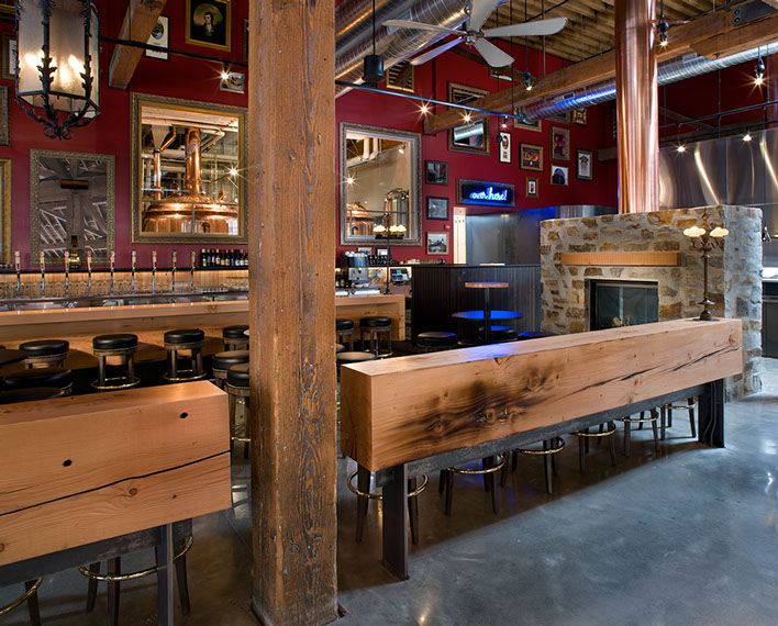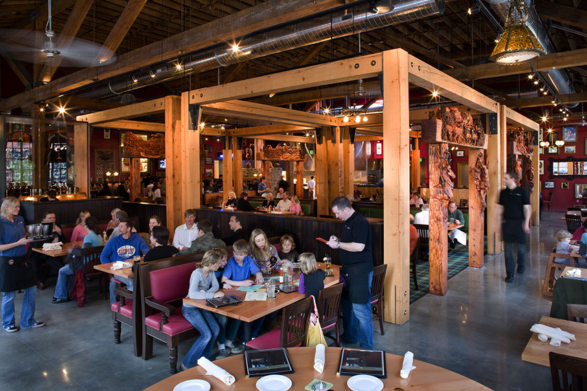 “To tame the big space into an intimate restaurant, bar and brewery, Emmons Architects incorporated a blend of Northwest elements, like exposed timber beams, with dark Scottish colors and walls peppered with whimsical items.”