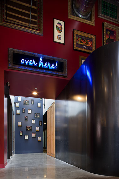 ‘the restrooms are amazing’ customers say. The men’s room is a vast space, with huge urinals and a view to the grain silo above through the skylight. Getting to the restrooms is half the fun, past the Brewery, to the awards wall that soars up to a high skylight, through the infinity room.