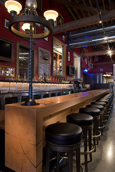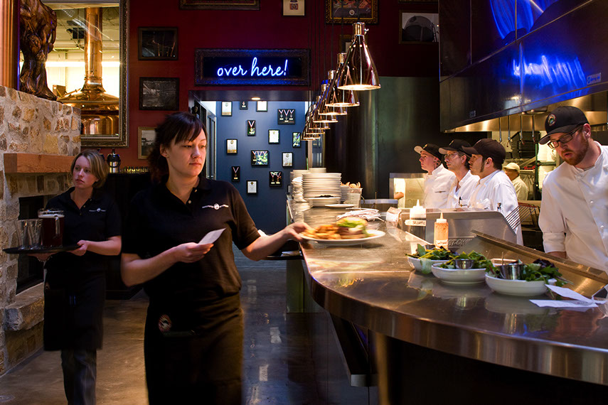is pushed out into the Pub so it is part of the party. The chefs and cooks like working here, and the public likes seeing the action in the kitchen. We designed the Pub so customers walk past the kitchen to get to the restrooms, trophy wall, and to see the Brewery.