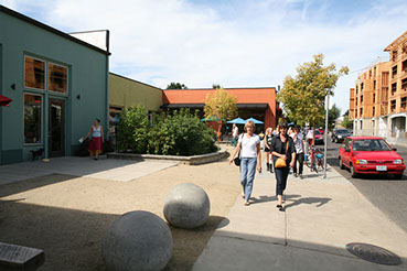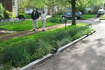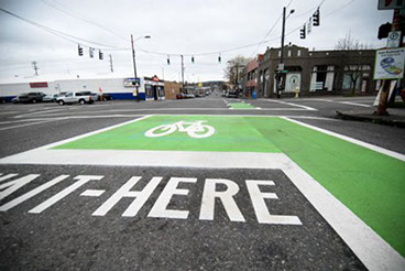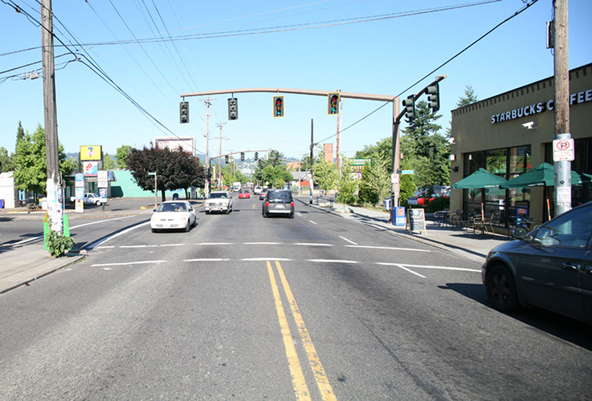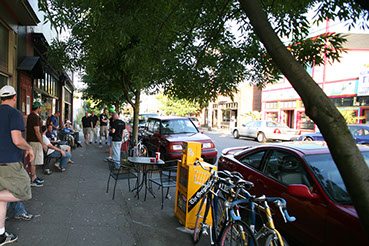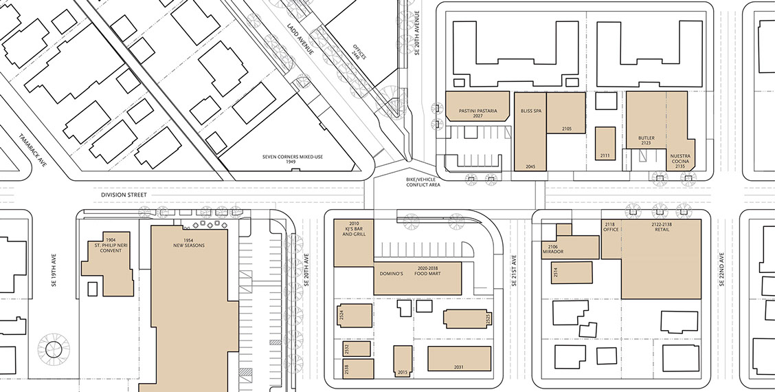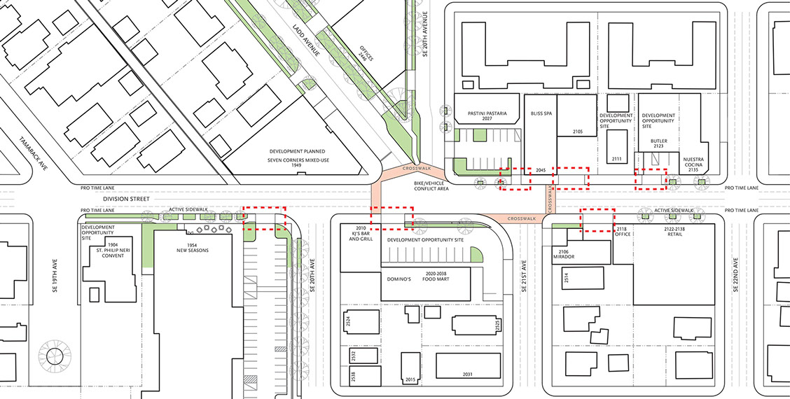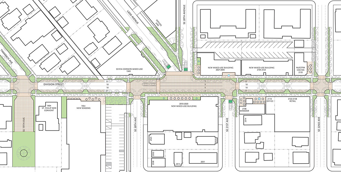 Division Street has great neighborhoods around it, and some good retail, but the street, especially around the ‘Seven Corners’ area, was a wide, inhospitable street with strip mall buildings in some places. The water bureau needed to run a new sewer down the street, and the community and City believed this to be the perfect time to address the quality of Division Street, and make it far more sustainable as well, with a large tree canopy and all public stormwater managed naturally in bioswales rather than a storm sewer. ‘Pro-time’ drive lanes for rush hour traffic promoted by transportation engineers made existing crosswalks long and dangerous, and added to impervious surfaces in the district. After much community pressure, pro-time lanes were eliminated in this area and bioswales and pedestrian friendly crosswalks were added. Bikes were also a consideration, as there was a main bike route from SE Portland going into center city through the Seven Corners area and Ladd’s addition. The new plan was designed to increase bike safety as well.
