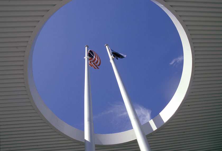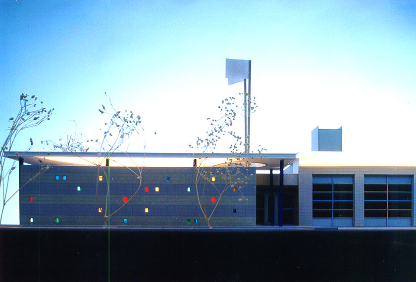 The addition on the west, facing the street, extended the existing apparatus bay to allow for new, larger equipment on the south side of the addition. In the center is a new entry court, with a circular roof opening overhead with two flagpoles protruding through it. On the north side of the addition is an open-air enclosure for an emergency vehicle. Facing the street is a curved masonry block wall with colored block glass infill pieces. The project has lighting to provide a focus on the colored glass and roof panels. The addition is scaled to be identifiable to cars passing by, as well as passengers. The design was influenced by roadside architecture from the 1930's - 50's and the some existing buildings on the street.