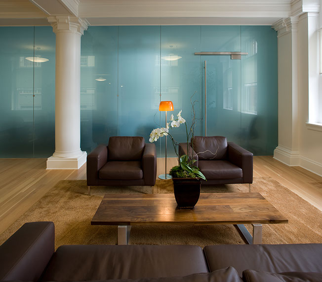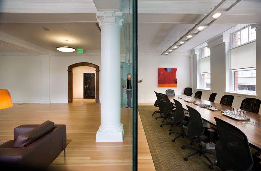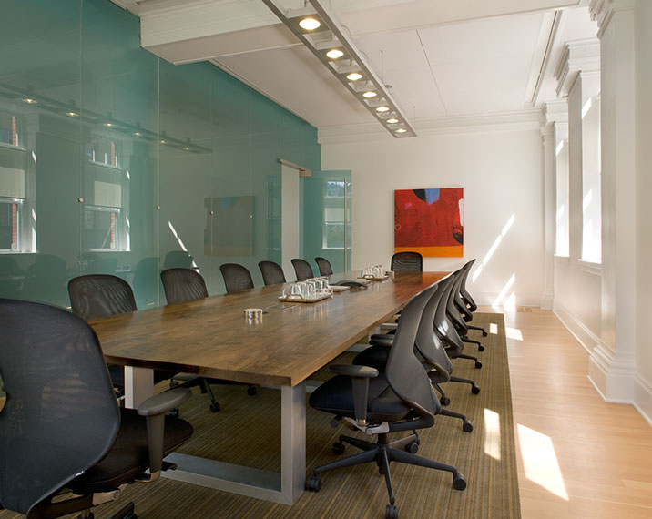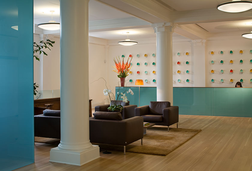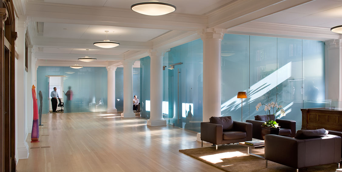 A large room welcomes people. Waiting, meeting, large and small events, and gathering happen here. It also was designed to show art installations from time to time. The space is the new heart of the company, designed to set a tone of respect for history, while embracing contemporary design; an emphasis on gathering and sharing ideas in a collaborative way; and to emphasize the importance of art and culture to the company. The company makes and runs housing, mostly for mid and lower income people. The first view of the space is of a sculpture of 72 small glass houses designed by Sean Healy on a wall behind a large glass reception desk, framed by historic columns, pilasters and coffers. Turning around, the full expanse of the space opens up to view. Rows of oak desks with typewriters used in 1910 are a distant memory, then replaced by endless boxes of rags until a year ago, when the transformation took place. Soot covered, but beautiful plaster columns and coffering, large windows, oak framed interior doors, interior windows with beautiful stained glass confirmed that this space had great potential and almost asked for a new life. It wanted to be reinvented to get back to a proud past as the gleaming headquarters for the Crane Plumbing Company.