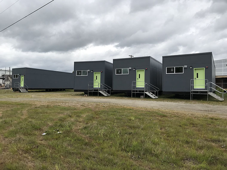 72 people experiencing homelessness at a time will now have a supportive place to stay. Safe, warm, dry, with dignity. And compassion. And a route off the street and into housing. King County Modular Shelter is the bridge, the vehicle to get people moving towards a life that has hope. The site is on Elliott Avenue north of downtown Seattle, and the buildings are designed to be able to be moved with relative ease.