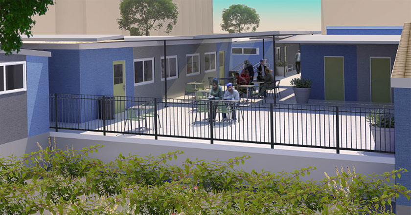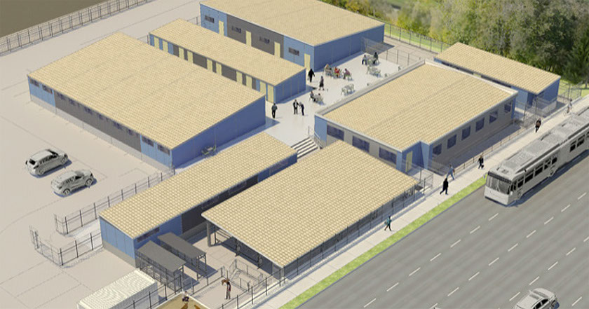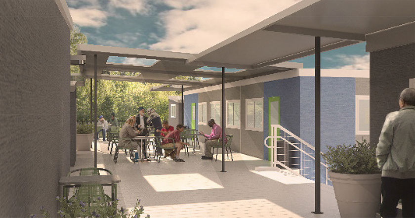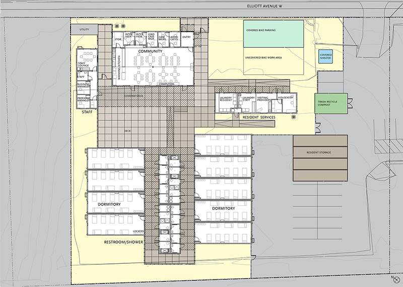 • The Community Building includes the campus entry, community gathering room, a warming kitchen, interview rooms and offices for staff. Sight lines and adjacencies are carefully designed to maximize safety, oversight and social interaction.