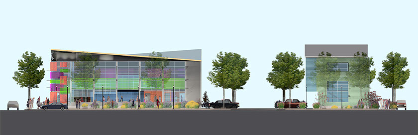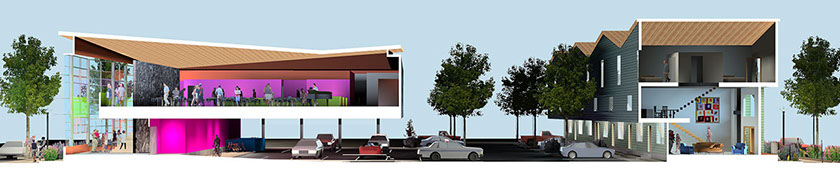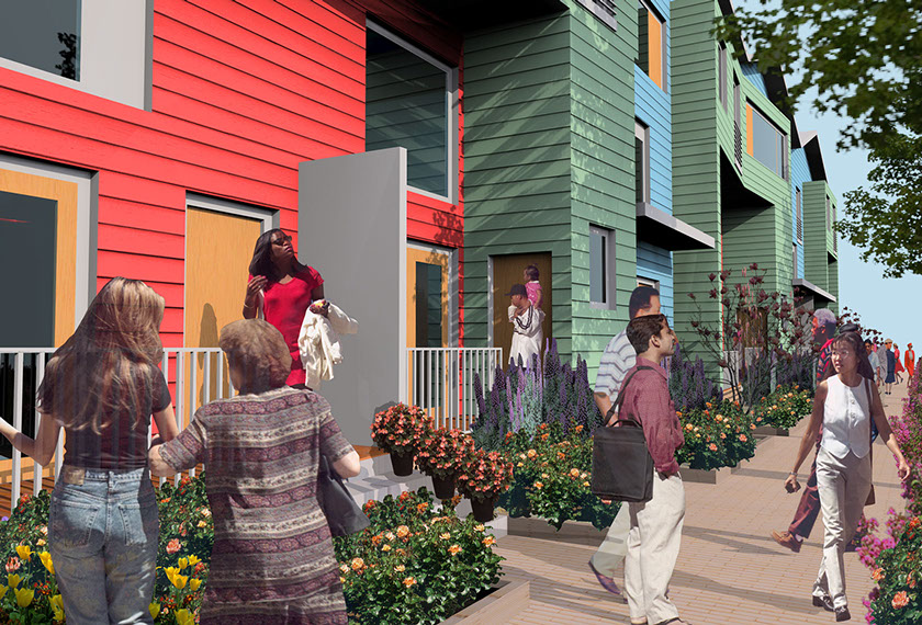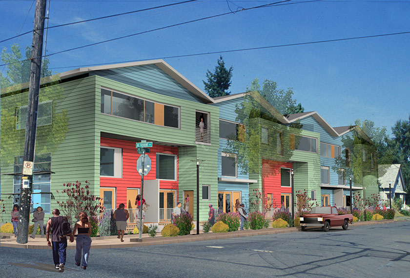 Behind the community restaurant building were affordable townhouses on Grand Avenue for larger families that were designed to help activate and put eyes on their street.