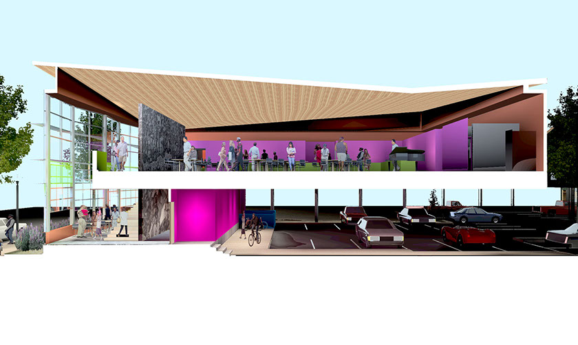 Portland's Martin Luther King, Jr. Boulevard sidewalks needed people, and the community needed good gathering places, so we designed a two story community restaurant on the corner. Large garage doors open the restaurant to the sidewalk, people at tables can talk with people on the sidewalk. Upstairs, large common tables with open seating would help bring people in the community together. It was designed to be a fun space, with good food, good drink and a good vibe.