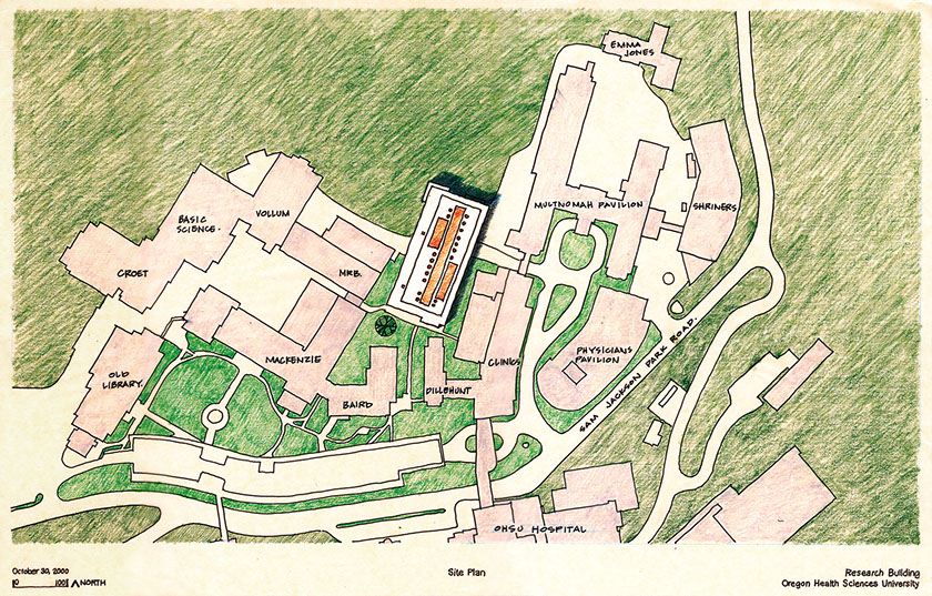 The OHSU Central Campus Master Plan was a plan the ravine area of the campus, and was designed to make the OHSU hospital and patient areas far easier to navigate for patients and visitors. It would also separate the university buildings and campus more from the hospital areas. The plan envisioned an east-west circulation spine of parking and a pedestrian bridge that would connect the existing hospital and new structures. This plan also considered the new South Waterfront campus, and how it connected to the existing OHSU campus on Marquam Hill. The plan was part of the planning for the new ‘Women’s Center Building’ to the east of the existing hospital building. After this plan, OHSU made the decision to incorporate the Women’s Center into a much larger building (now the Kohler Pavilion) that would also have surgery suites and in-patient rooms.