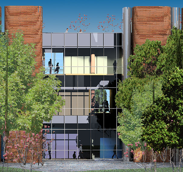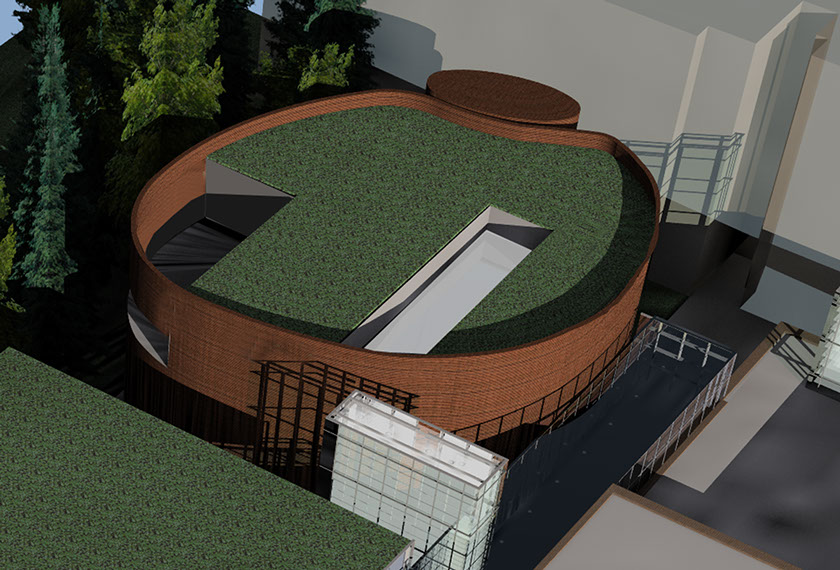 Academic wing, and an organically shaped special structure that housed a Patient Simulation Laboratory and Alumni gathering spaces. Between the historic and new structures was a glass enclosed Atrium that had sinewy, intertwined ramps and stairs to encourage people pass-bys, and comraderie. The form of the ramps was a reference to the human circulatory system and muscles.