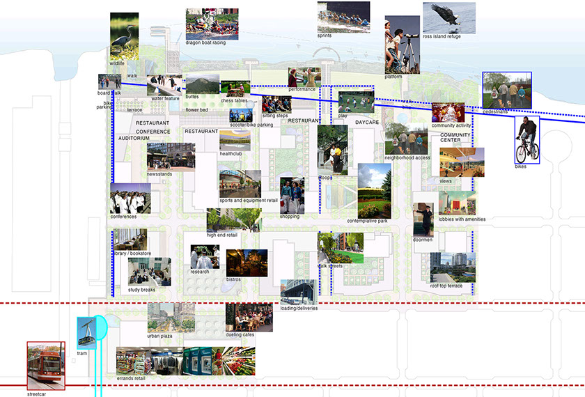 We saw a tranquil overlook of the river, a nearby wildlife sanctuary, and dramatic views of the Cascade Mountains. This area called for the thoughtful creation of an entirely new neighborhood. This new pedestrian-oriented community will come alive by a layered composition of neighborhood magnets. Magnets are strategically placed to move people along the sidewalks and give everyone an urban adventure.