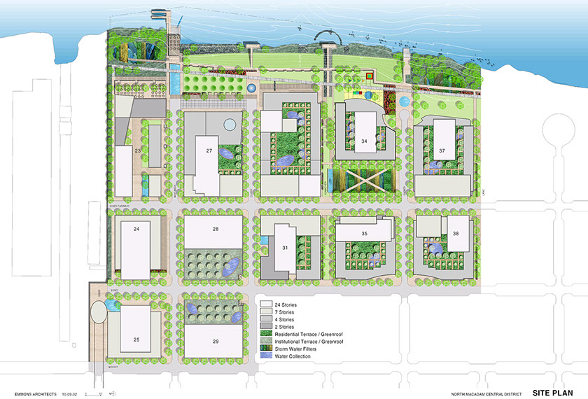 Buildings are designed to maximize human activity on the street, using the ground, second and third floors to make the streets vibrant. Structures are envisioned as parts of the whole — neighboring buildings relate to each other — and contribute to the character of each street. Existing forms and materials from the site are used to add richness.