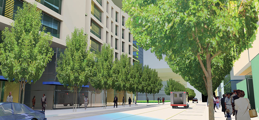 Whitaker Street - the Campus Square - inspired by Harvard Square - designed to maximize street life.