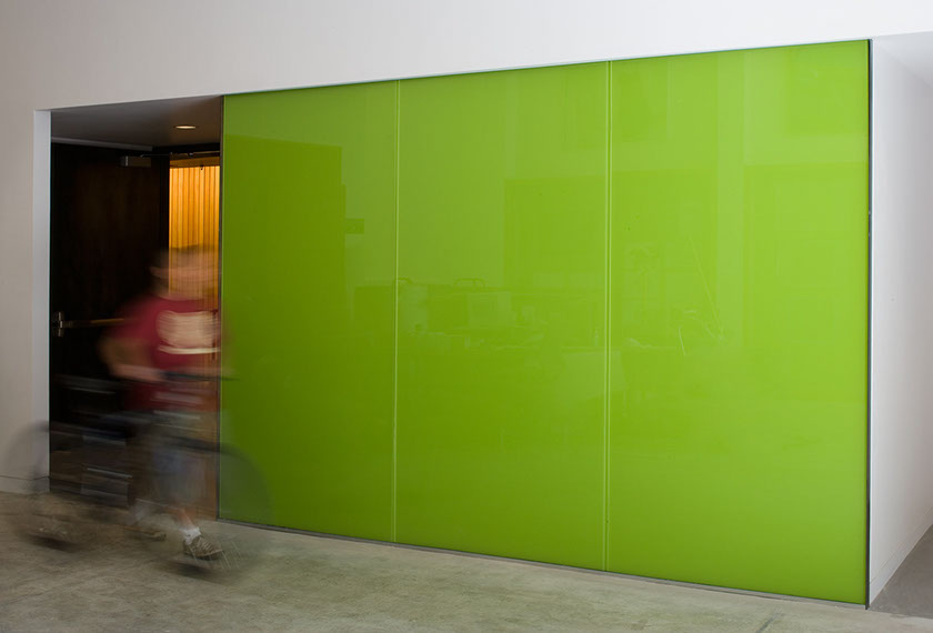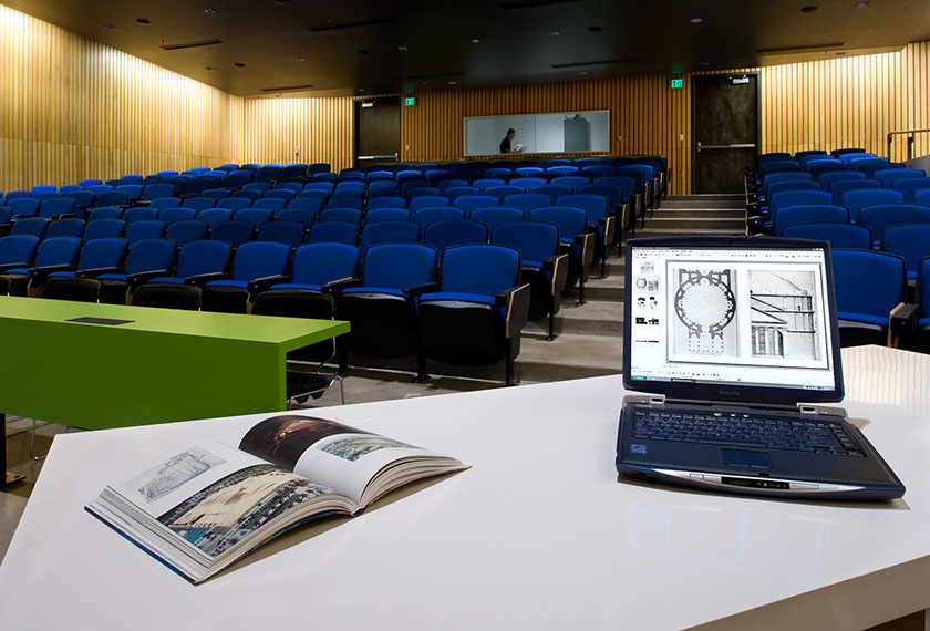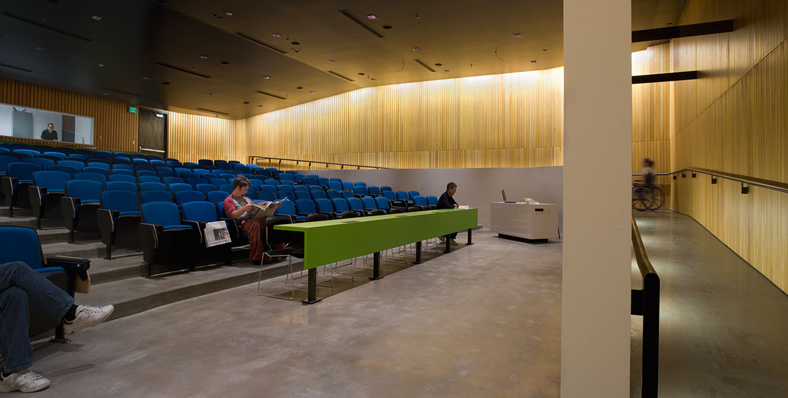 The existing room was cavernous, inaccessible, noisy, cold, uninviting and very uncomfortable. It was Oregon’s leading design school’s primary lecture hall. We significantly decreased the room’s volume as well as making it fully accessible by bringing in six feet of fill to the room and repouring the floor. A ramp curves down one side and around the back of the projection wall to make the room accessible. Entries were redesigned with light and sound breaks from the distracting adjacent lobby, and the acoustics were carefully reworked so everyone could hear the lecturer without amplification. Seats were chosen for comfort and function. At the room’s entry, an unexpected green glass wall startles the passer by. A glimpse of a warm fir wall is caught.