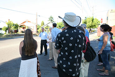 Division Street has great neighborhoods around it, and some good retail, but the street, especially around the ‘Seven Corners’ area, was a wide, inhospitable street with strip mall buildings in some places. The water bureau needed to run a new sewer down the street, and the community and City believed this to be the perfect time to address the quality of Division Street, and make it far more sustainable as well, with a large tree canopy and all public stormwater managed naturally in bioswales rather than a storm sewer. ‘Pro-time’ drive lanes for rush hour traffic promoted by transportation engineers made existing crosswalks long and dangerous, and added to impervious surfaces in the district. After much community pressure, pro-time lanes were eliminated in this area and bioswales and pedestrian friendly crosswalks were added. Bikes were also a consideration, as there was a main bike route from SE Portland going into center city through the Seven Corners area and Ladd’s addition. The new plan was designed to increase bike safety as well.