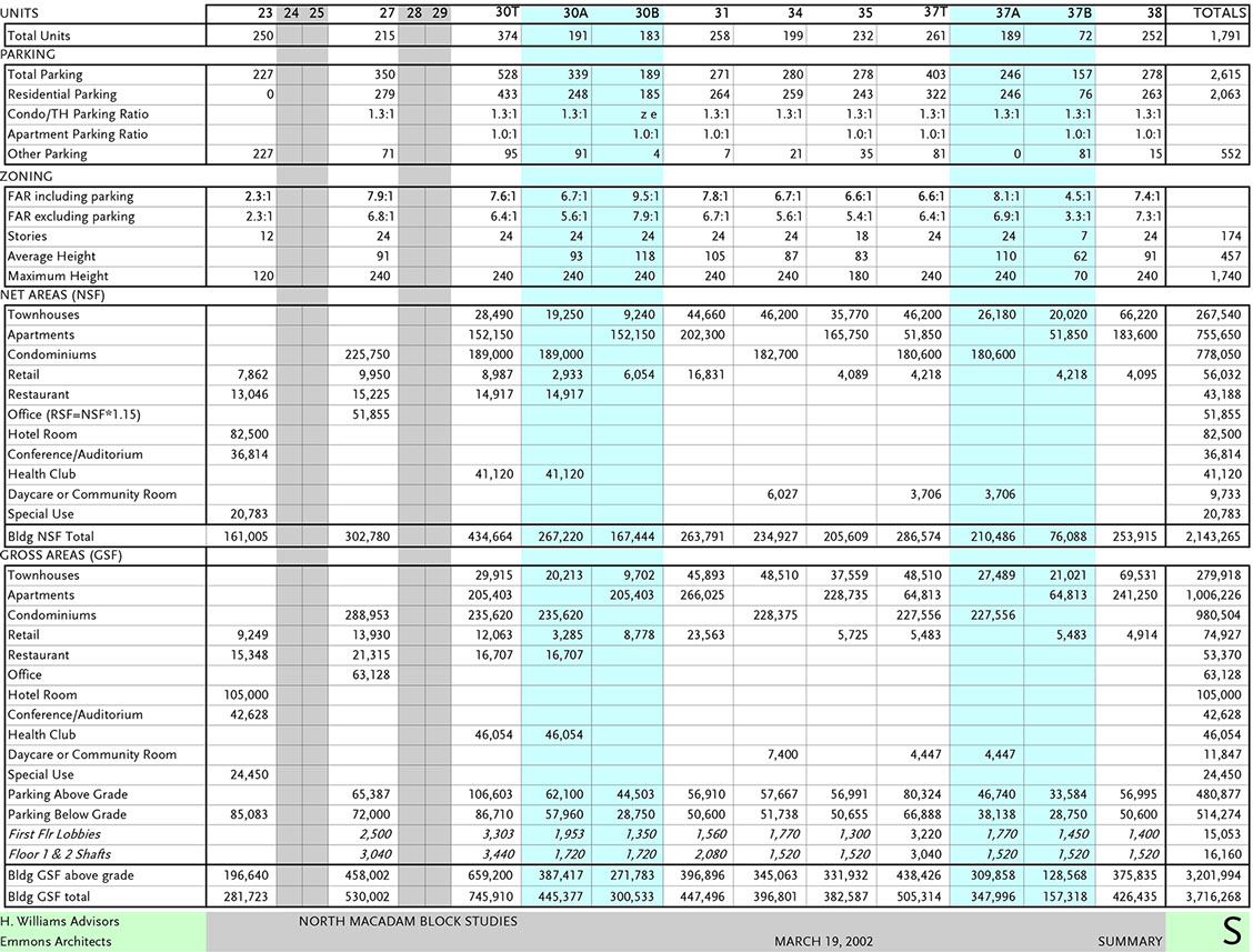 This is the summary page of the South Waterfront 'Blue Book', the book Emmons prepared to determine the capacity and program for the first phase of South Waterfront development. Each number on the top row 23, 24, etc.) represents a 40,000 SF or larger block in the district. The Blue Book was used as a basis for district wide proformas and ultimately led to the agreements that resulted in the development of South Waterfront.